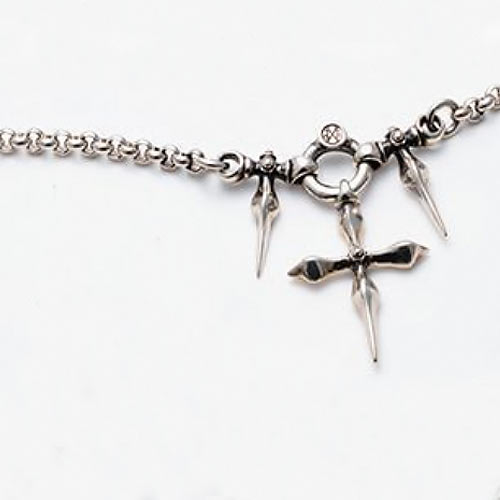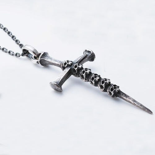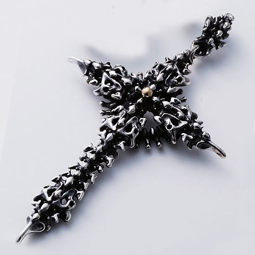 釘をモチーフにしたクロスに6体のスカルを突き刺した存在感抜群のネックレス。武骨な風合いとスカルが見事にマッチ。気づく人は気づく、ある意味が込められている。6万円(税抜)