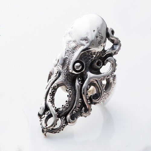 タコをモチーフにした、唯一無二のデザイン。躍動感を感じさせる、生々しいフォルムと脚の透かし彫りが、強烈なインパクトを与えます。3万円(税抜)