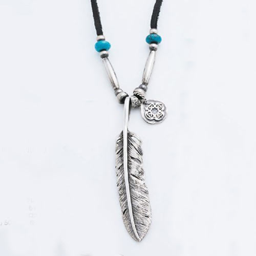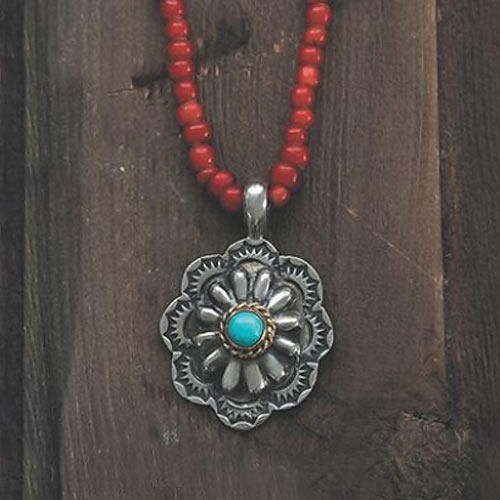 ハンドメイドのリポウズスタンプワークのフラワーコンチョペンダントにターコイズをオン。ビーズは1800年代後半~1900年代初頭のヴィンテージ品を使用。3万7000円(税抜)