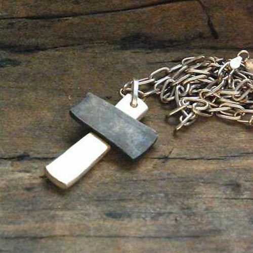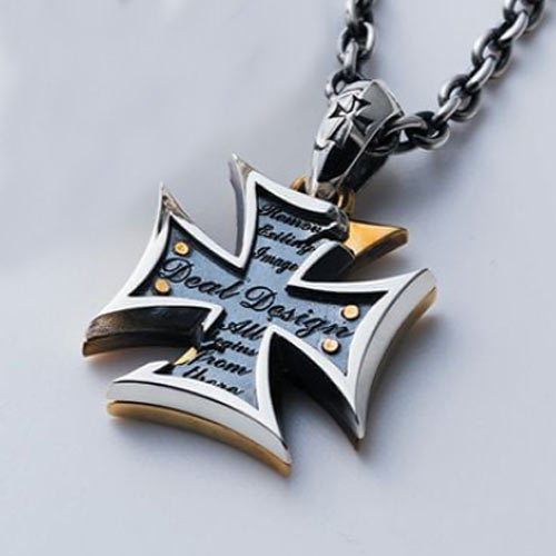 シルバーとブラスのアイアンクロスを重ねてアンティークテイストに。ひび割れと欠けたデザインが存在感を醸す。1万4000円(税抜)
