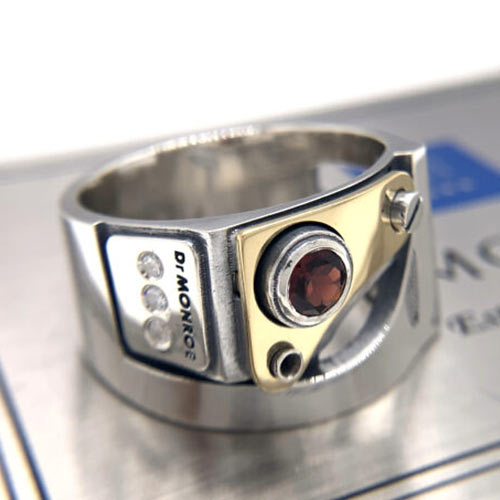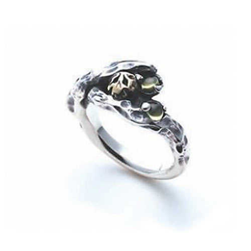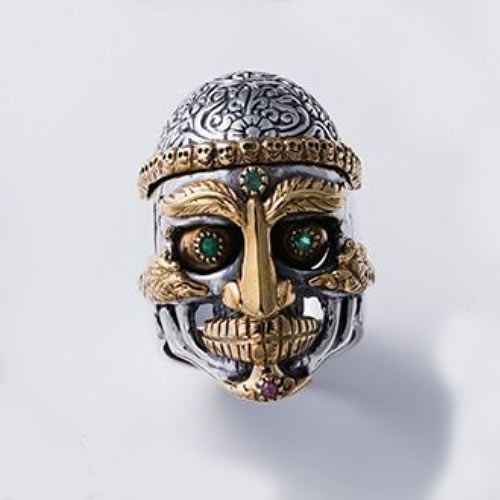 チベットに伝わる装飾宝具のスカルをモチーフに、真鍮のコンビワークで荘厳なデザインに仕上げたリング。両目と第三の目にエメラルド、題にはルビーがセットされています。4万円(税抜)