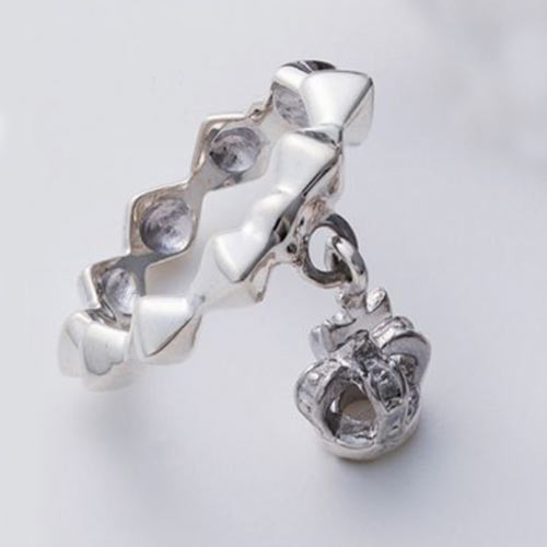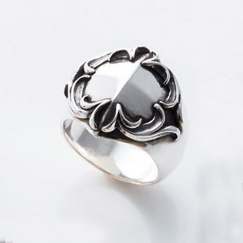 アクセサリーの定番モチーフのひとつであるクラウンを独特のシルエットで表現した意欲作。リング全面には極限まで細かく表現した唐草模様が刻まれている。3万1000円(税抜)
