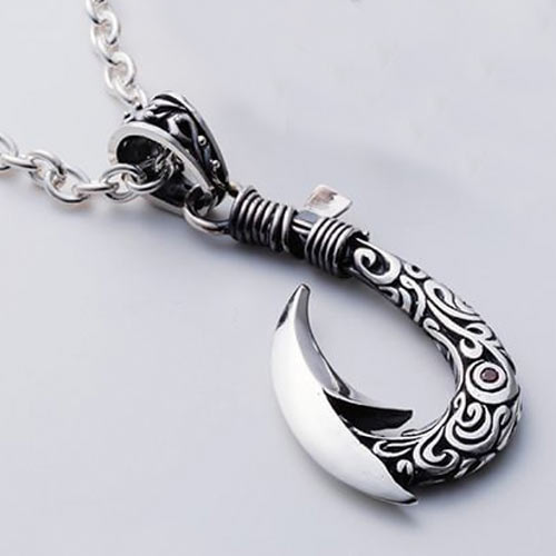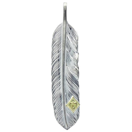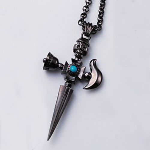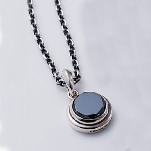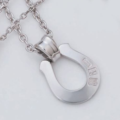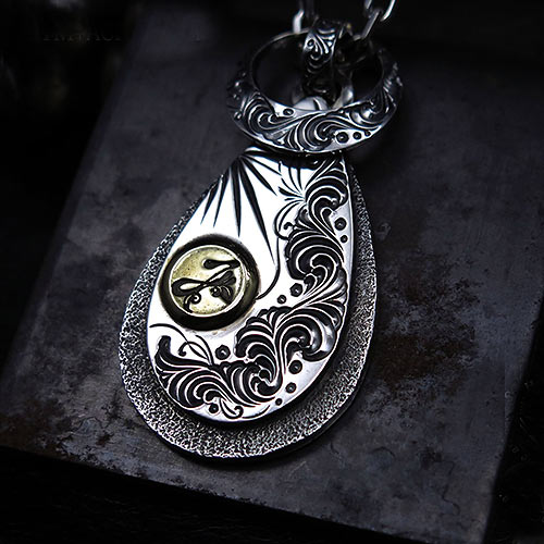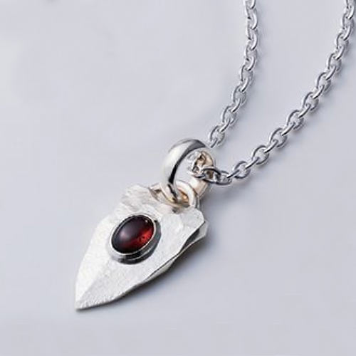 イーグルグリップのナイフ型ペンダントヘッドにガーネットをオン。裏面には、唐草模様が彫られリバーシブルで楽しめます。1万3000円(税抜)