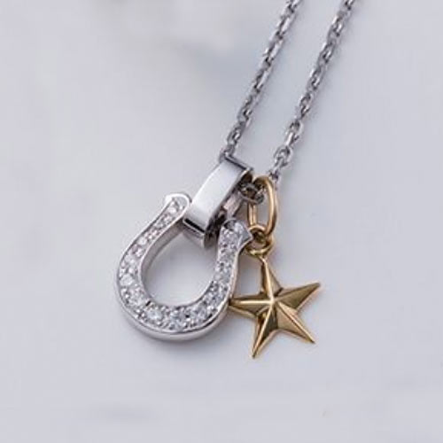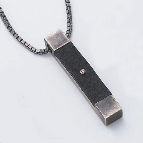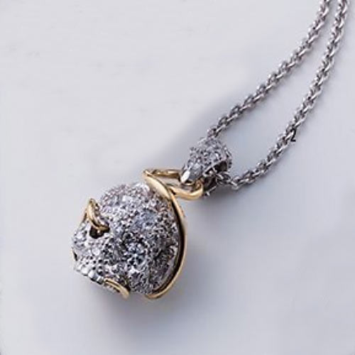 リングと同テーマで制作されたペンダント。遠近法を利用した立体感のあるデザイン。遊び心としてボディにはハート、スペード、ダイヤ、クローバーの図柄が隠れています。3万2000円(税抜)