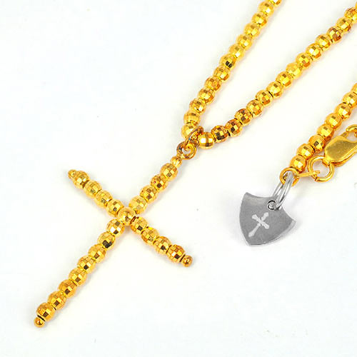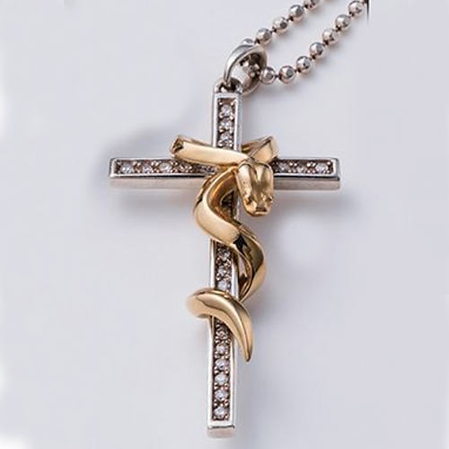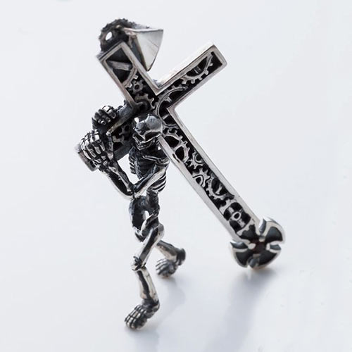 十字架を背負う骸骨のペンダントトップ。十字架に造車で運命を表現し、付け根に成功や勝利を意味するガーネットを装着。1万5000円(税抜)