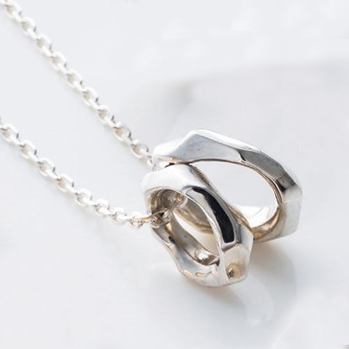 永遠と再生の象徴とされる「ウロボロス」を独自のフィルターで表現したペンダント。ウロコを六角形にデザイン。2万5000円(税抜)