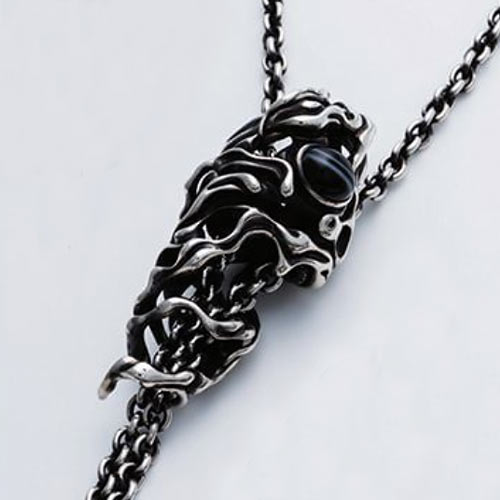 ドージェの先端にドラゴンフェイスを組み込んだブランドを代表するペンダント。細部に至るまで緻密な彫刻が施され、存在感抜群です。1万5000円(税抜)チェーンは60センチ1万7000円(税抜)