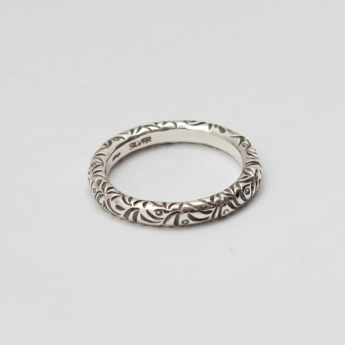 ブランドの定番となっているスクエアリング。余すとこなくリング全面に装飾された唐草模様が抜群のインパクトを放っている。落ち着いた印象で大人っぽい。3万4000円(税抜)