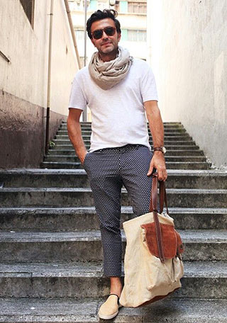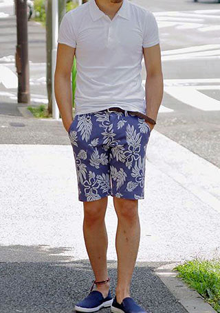 白Tシャツに柄パンツを合わせたオーソドックスなスタイルに、リビエラのスリッポンをMIX。一気にリゾートテイスト漂うコーディネートに。