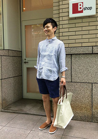 これは真似したい!ギンガムチェックシャツ×ショーツの組み合わせに、リビエラのスエードスリッポンをチョイス。カジュアル中にもさりげなく高級感を。