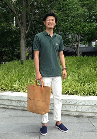 上品なポロシャツコーデを、スリッポンでリゾートカジュアルダウン。肩肘張らない雰囲気に。