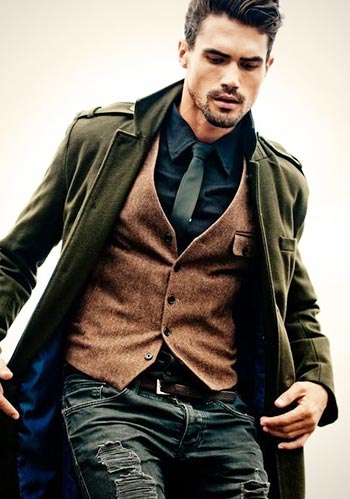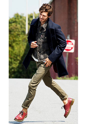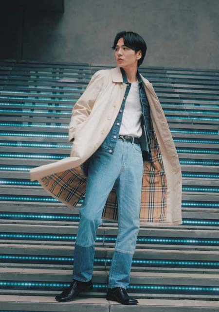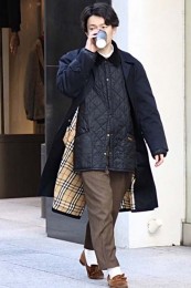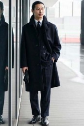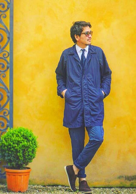 実際の着方としては写真左のようにボタンを上まで留めて着ても、右の俳優のように開けてコーディネイトを見せる着こなしでも様になります。さらに上級者ともなれば、襟先についたボタンを留めて襟を立てる着方もあり、これは多少の雨や風の侵入を防ぐ効果も。