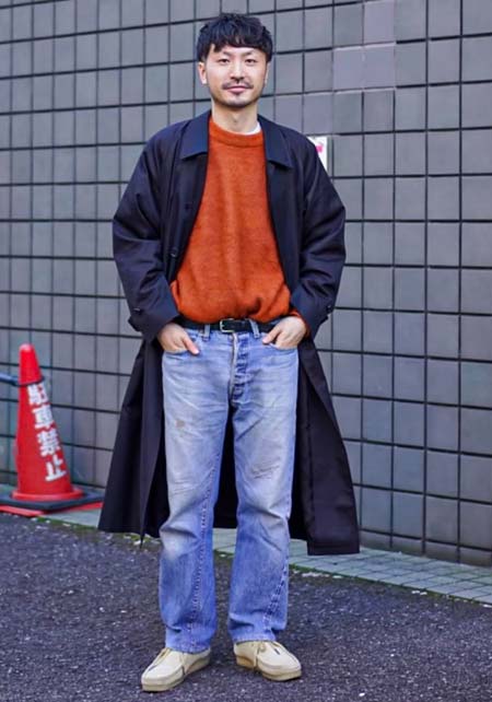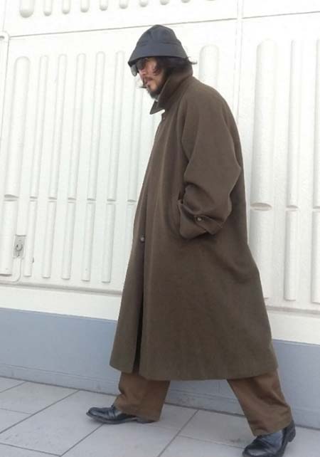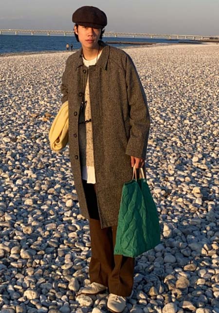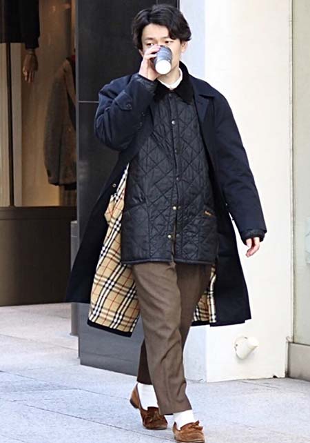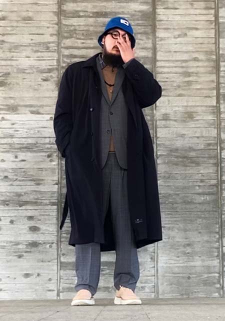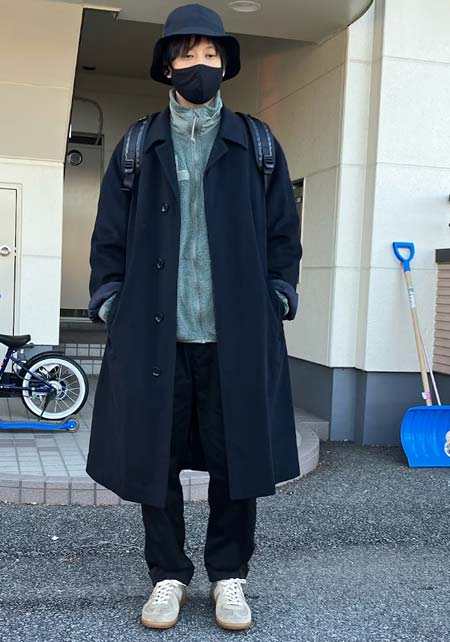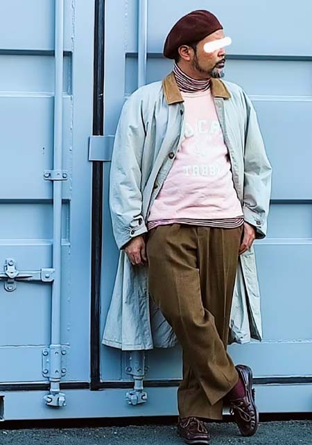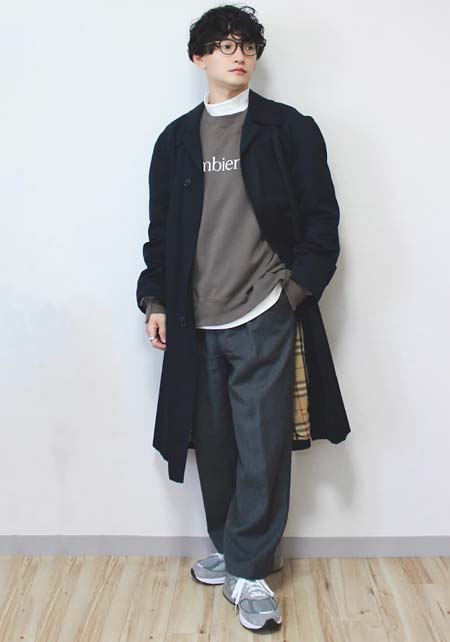 〈コーデ〉こっくりと渋味なオイルドコートを着用。ともすれば重々しく見えてしまうアウターですが、柔和な顔つきのグレースウェットを投入すれば堅苦しさを感じさせない。