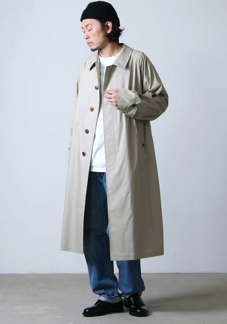 伝統的なミリタリークロスであるギャバジンを使用したステンカラー。上品な表面感がありつつも”短めの着丈”に仕上げることで軽快な印象に。シルエットはAラインで直線的。