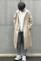 今までにない新感覚! フード付きで上品カジュアルにデザインされたステンカラーコート。素材はハリと光沢のある生地を使うことで”カジュアル過ぎない”印象に。通学・休日ともに活躍。
