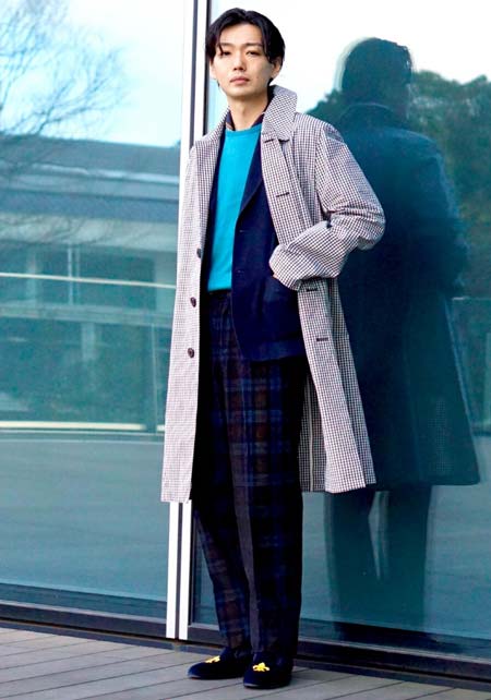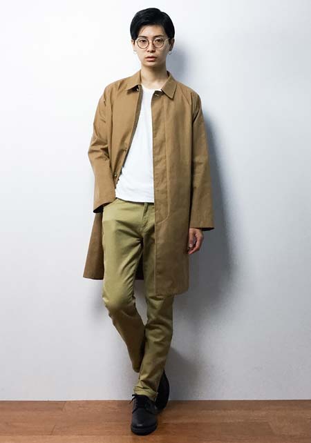 真面目なステンカラーに、素材でくつろぎ感を表現。