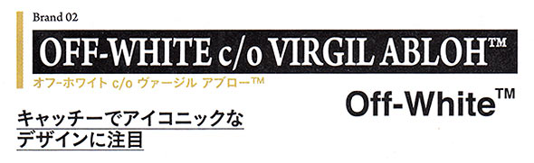2014年にカニエ・ウェストのクリエイティブディレクターでもあるヴァージル・アブローがスタートさせたブランド。メイド・イン・イタリーの上質なストリートアイテムを提案している。