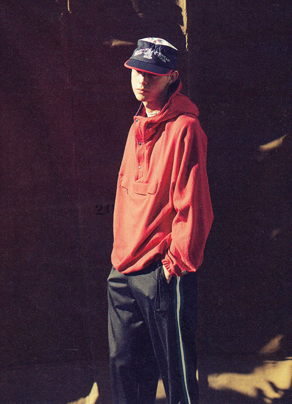 スウェット素材のアノラックパーカとトラックパンツは、今の気分に合うゆったりしたシルエットながら、どこか品のある雰囲気を漂わせる。パンチの利いたキャップもアクセント。