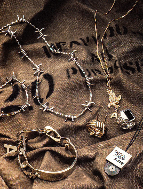 ハードな印象の有刺鉄線をモチーフとしたアクセサリーからイーグルモチーフやレコードまで、日常のあらゆる事象からインスパイア。コーデの主役として使いたい。