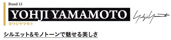 世界に通用する日本のファッションを生み出した第一人者、山本耀司が設立したブランド。時代に流されない反骨精神がモードファッション界にもたらした功績はあまりにも大きい。