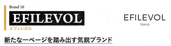2017年春夏コレクションより新たに若きデザイナーが着任し、クリエーションを行うエフィレボル。その動向はファッション業界注目の的。朴訥ながらも都会的な印象のアイテムは、洗練された野暮ったさを与えてくれる。