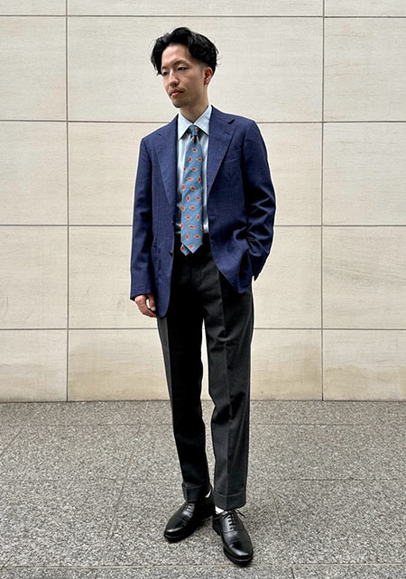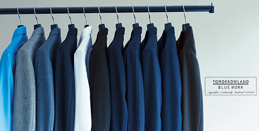 トレンドの短い着丈と細身シルエットに、クラシカルな要素をバランスよく取り入れた「トゥモローランド ブルーワーク」のスーツ。