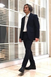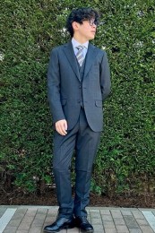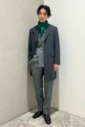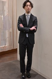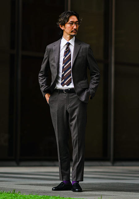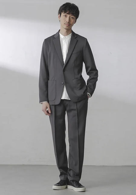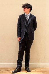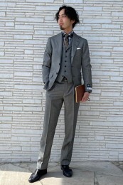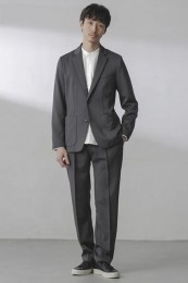 シルクを混紡した光沢感のある素材使いと、スタイリッシュなシルエットが自慢のスーツ。紳士服メーカーとは違い”スーツをファッションの一部”として考えたデザイン性の高い一着。