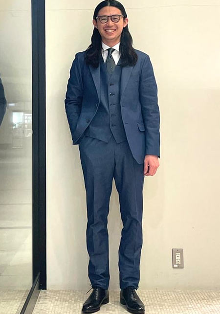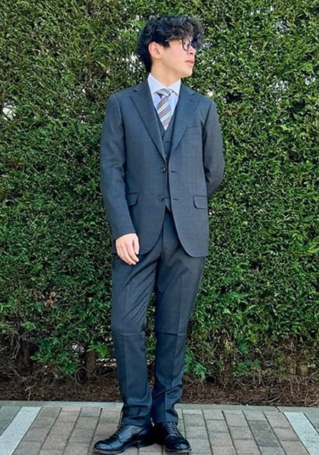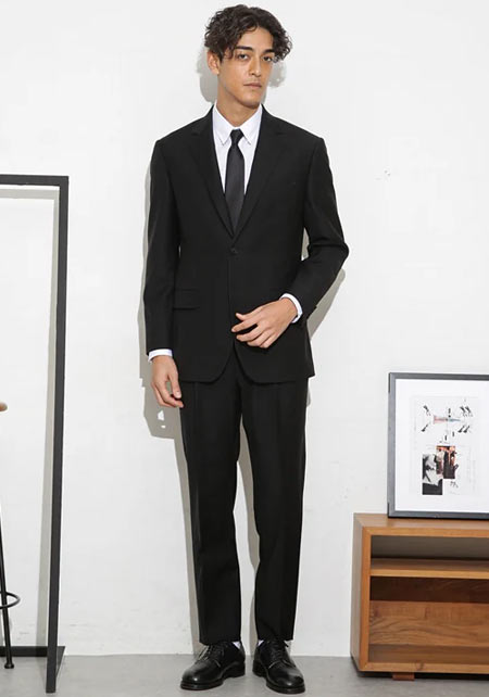 ビジネスやフォーマルを中心としたレーベル「ホワイトレーベル」のオリジナルスーツ。ナローラペルやシャープな細身シルエットで仕上げたフレッシャーズ(新社会人)に最適な一着。