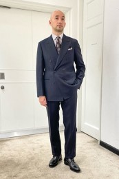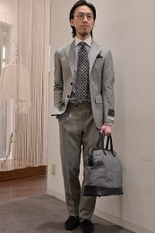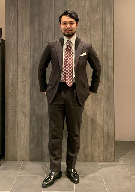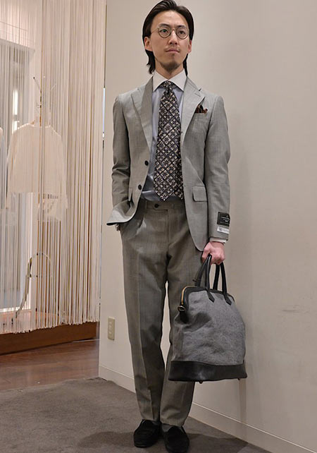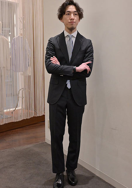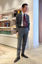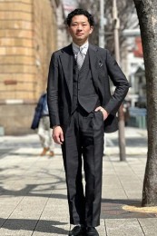 春夏向けのウール素材「トロピカルウール」を100%使用したオリジナルスーツ。見た目にも美しい光沢と肌触りに通気性をプラスした、軽くて上質な仕上がり。細めのラペルやスマートなフォルムなどトレンド要素も十分取り入れています。