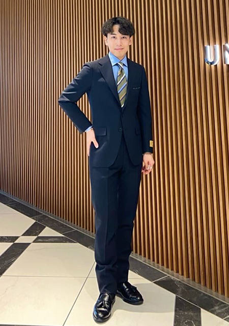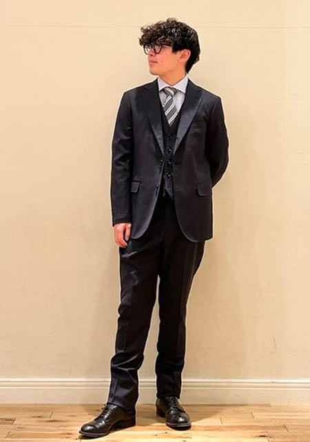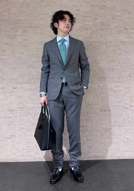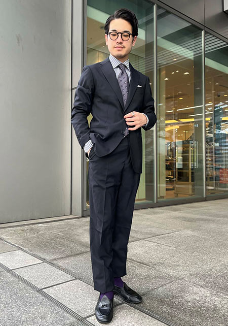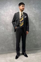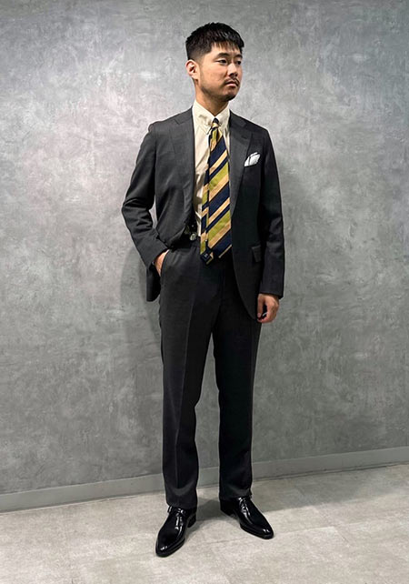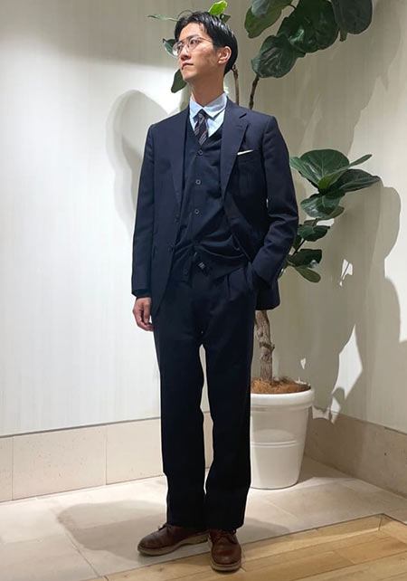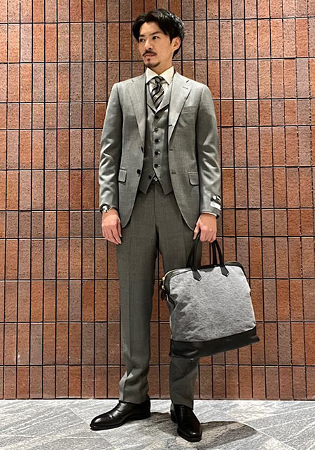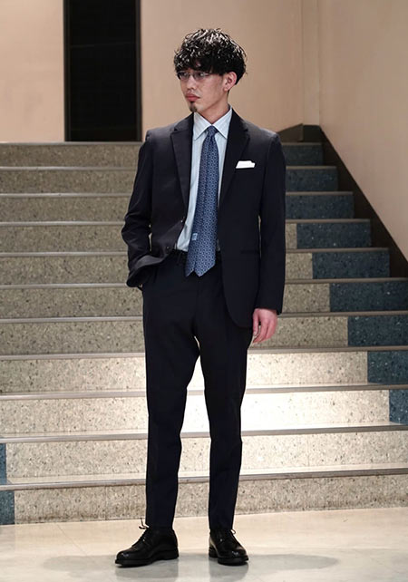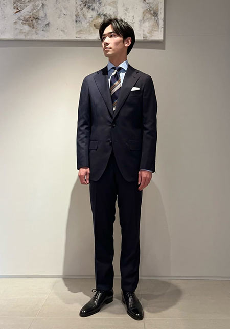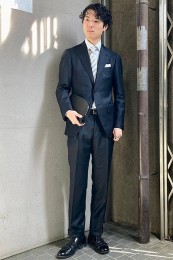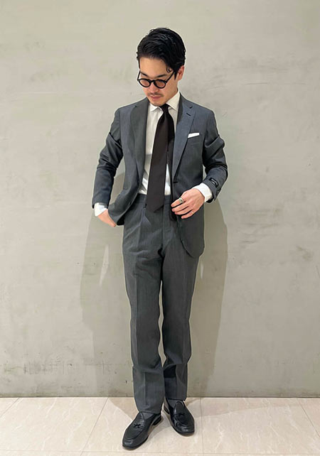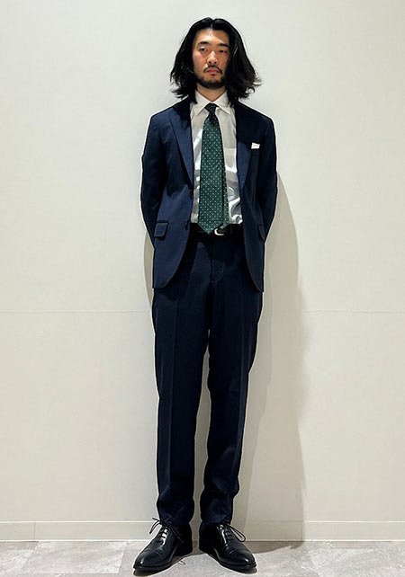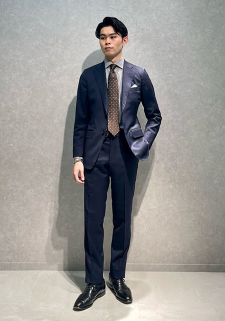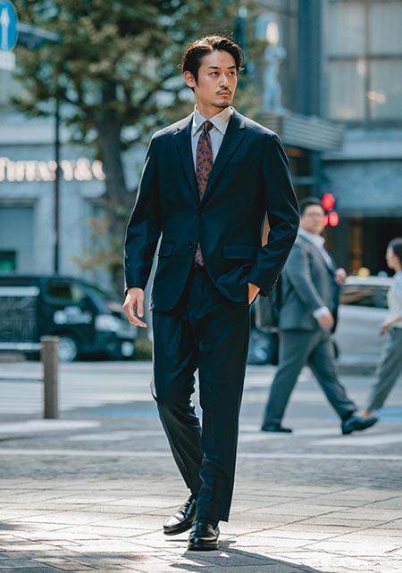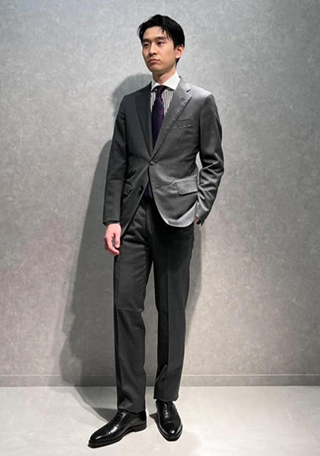 イタリアの有名服地メーカーの生地を採用し、スキニーフィットの美しいシルエットで仕上げたオリジナルスーツ。パンツは流行のスリムテーパードカットになっており、着るだけでスタイリッシュなビジネススタイルを演出。