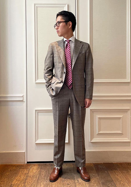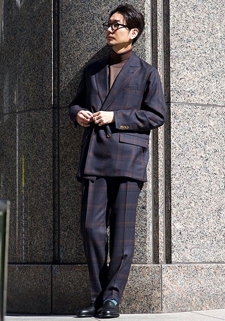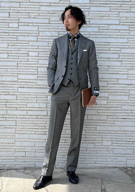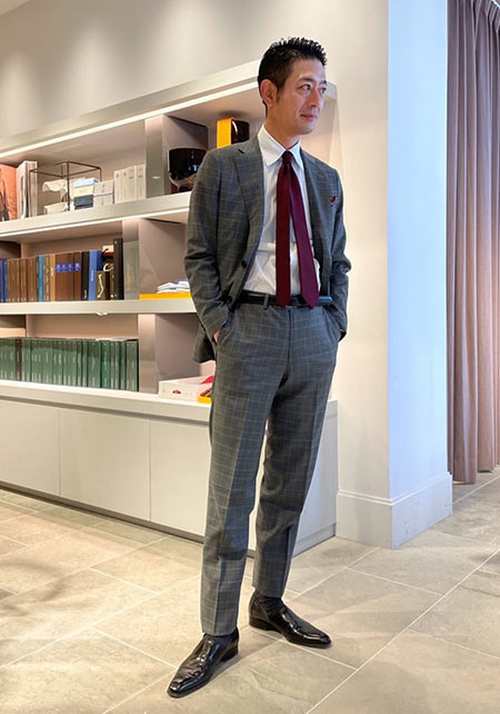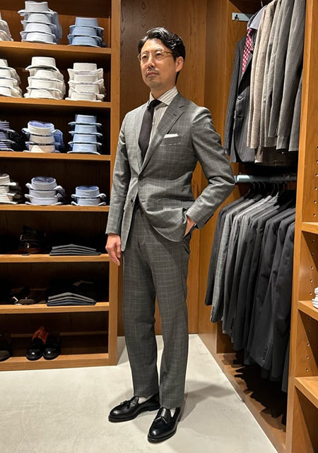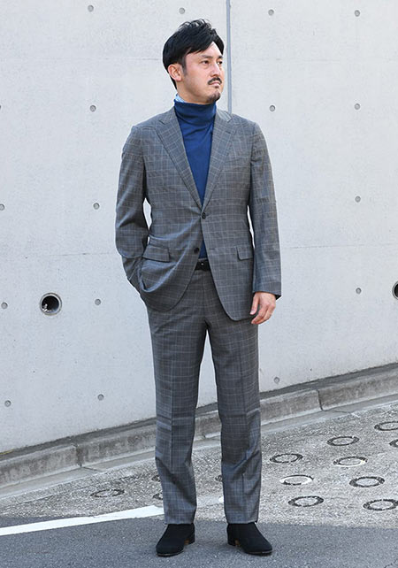 光の当たり具合により柄が浮かび上がるシャドウチェックのスーツ。無地とは違うさりげなくオシャレに楽しめる一着。