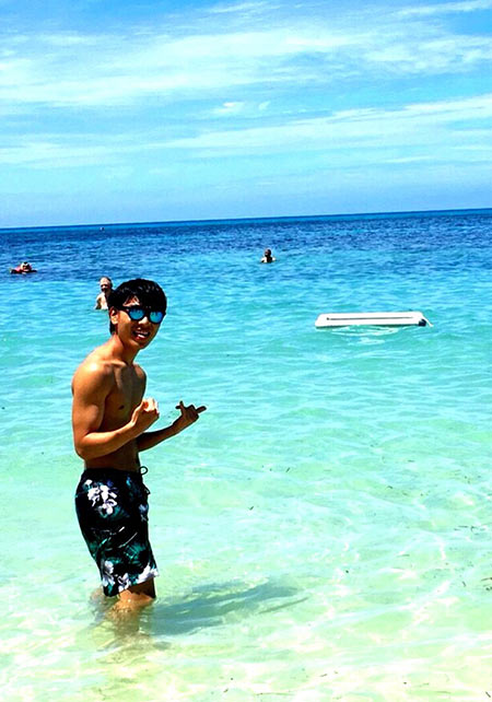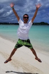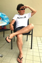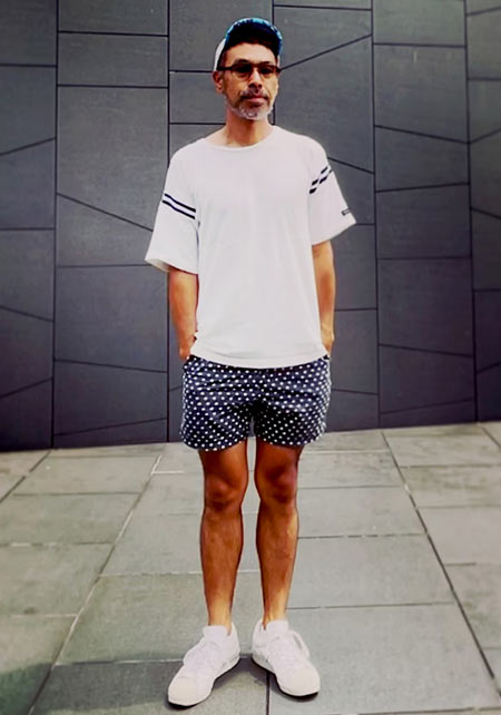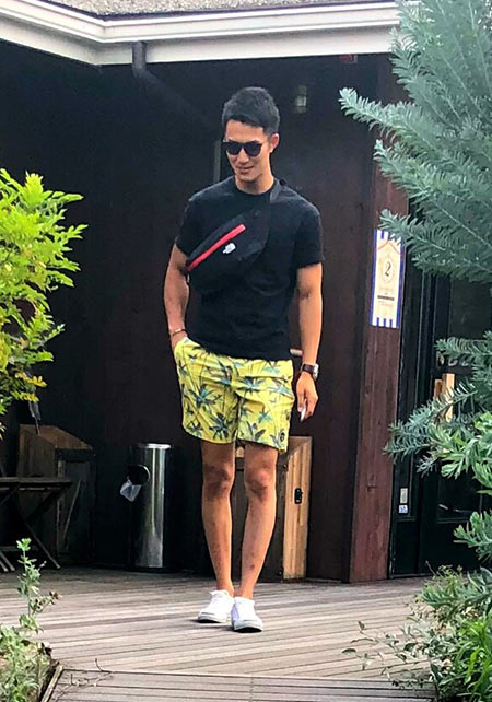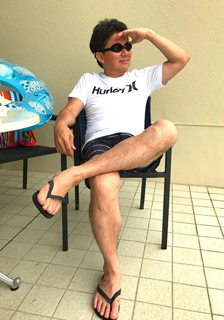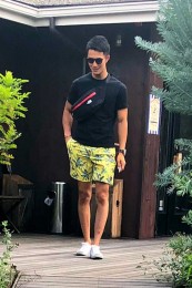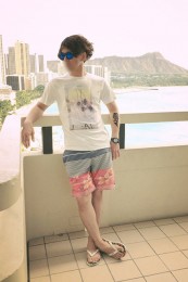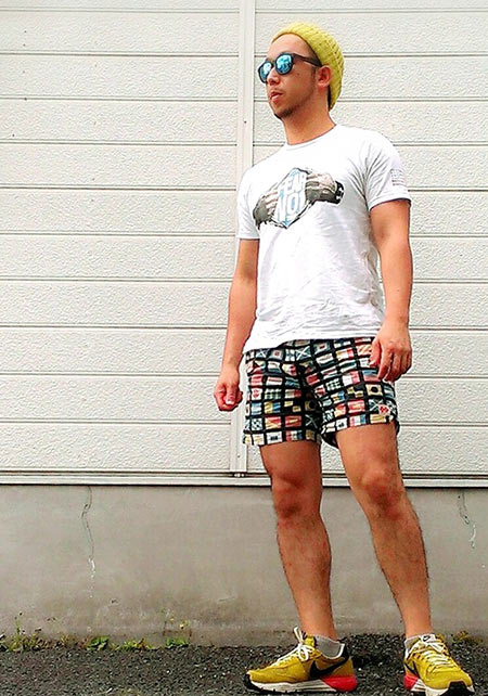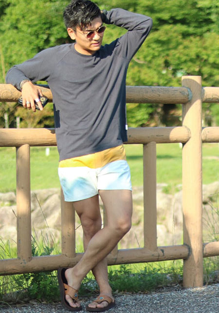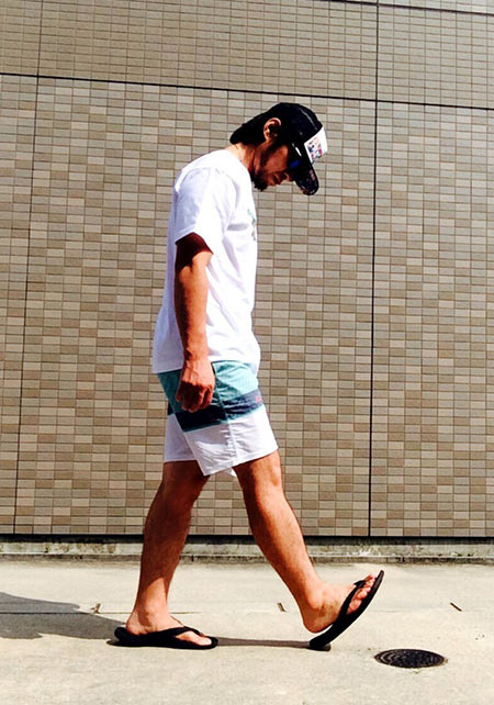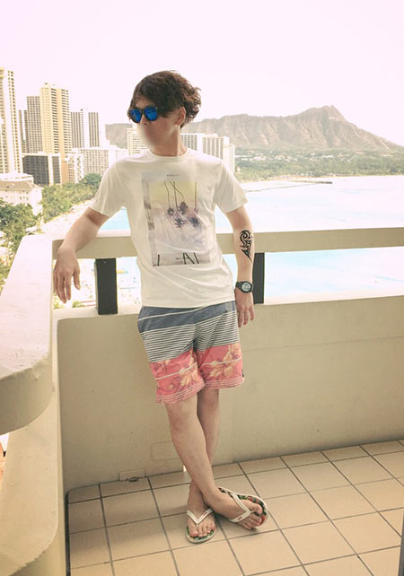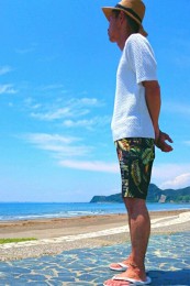 ヤシの葉を大胆にプリントしたボードショーツ。「男のカラダを魅力的に見せる」絶妙なカラーリングはさすが! 女性ウケも間違いなしです。