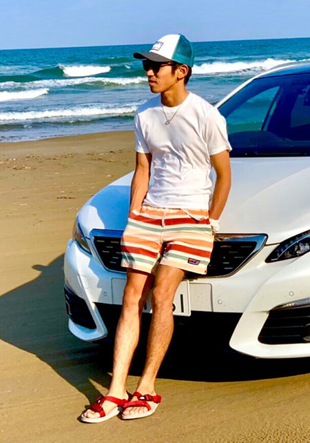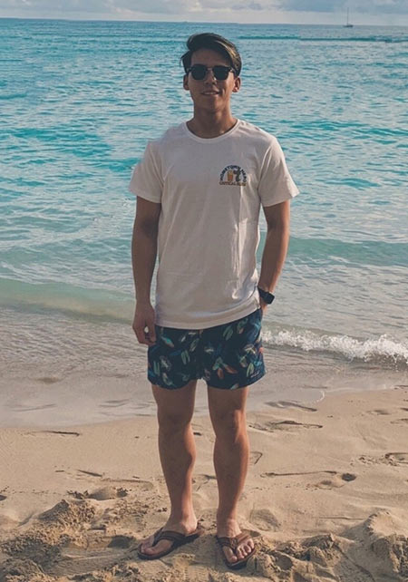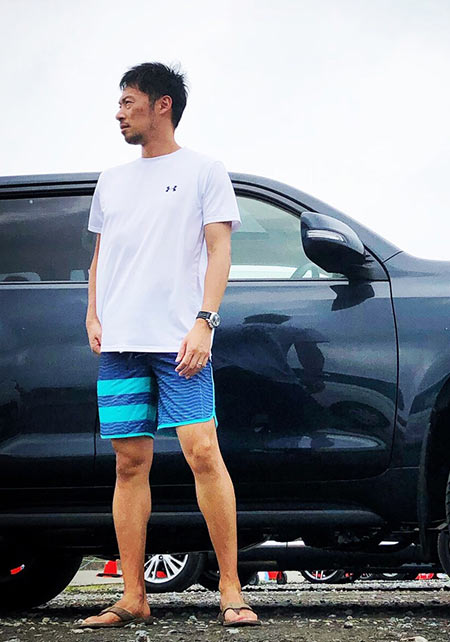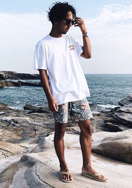 海辺が似合うスポーティなボードショーツ。スタイルよく見える上下カラーの比率、ホワイトカラーのアクセントなど、シンプルながらオシャレに着こなせる1枚。