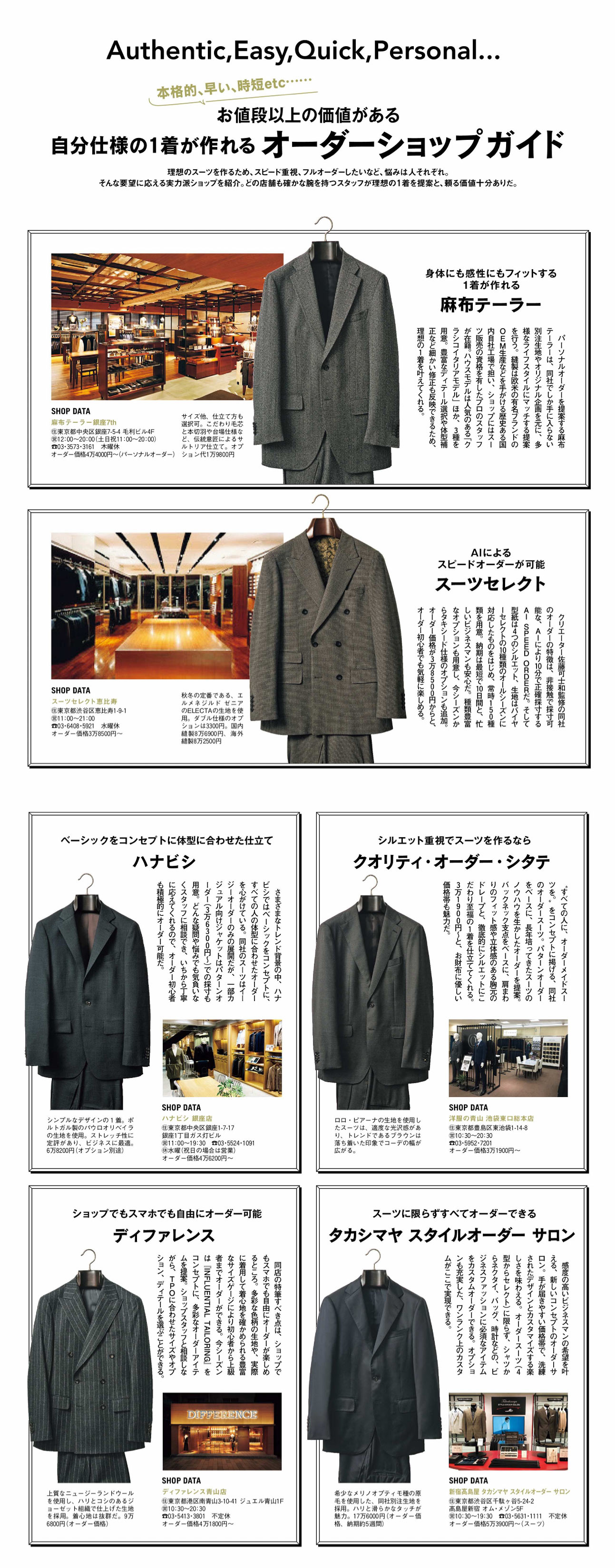 3万円台のコスパに優れた店~本格的なフルオーダー店まで…。
