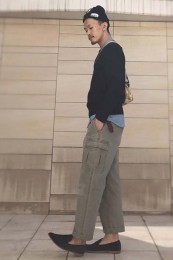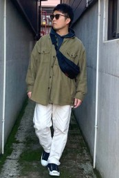 巻き方は「腰に巻く」だけじゃなく、「斜めがけ・肩がけ」の計3種類あります。中でも今っぽく見えるのは断然「斜めがけ」。アウターにINしたり、シャツであればOUTもINも様になります。