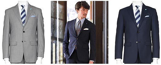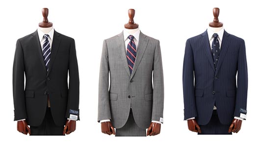就職活動に嬉しいリクルートスーツや、クールでドライな肌状態を保つハイテク素材『COOL MAX』採用スーツも有。