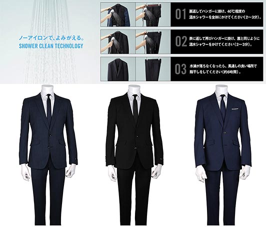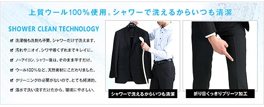 シャワー・洗濯機のどちらでも洗えるスーツ。汗などの汚れからシミ、ニオイ等も水洗いで簡単に落とせる。