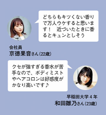 ボディミストは香水よりも香料が弱いため、ほのかな香りを楽しめる。一方で、シャンプーのさりげない香りが好き!という人はヘアコロンがオススメ。どちらもライトに香るから、香水ビギナーでも手軽にはじめられる。
