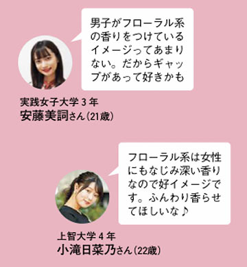 フローラル系は甘さと清潔感が溶け合った上品な香りで、包み込むようなふんわり感が特徴。繊細な花のフレグランスを男性が纏うことでギャップにもつながる。女子ウケもするから彼女とシェアできるのも魅力。