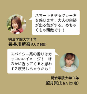 ピンクペッパー、ラム、タバコリーフで調香。洗練された大人の雰囲気をあたえる。