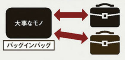 複数のカバンを使った時に起こる入れ忘れの問題には、カバンの中に小さいバッグインバッグを入れておくことで解消できます。必携のものはそこに入れておき、使うカバンにバッグインバッグごと入れるようにしましょう。