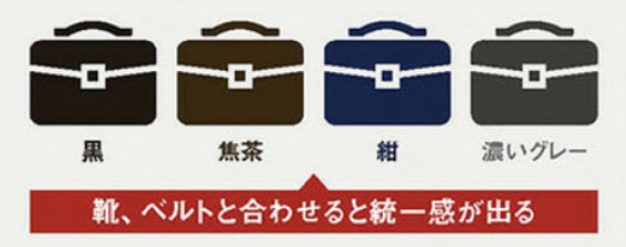 靴と同様に、カバンも色が濃いほどフォーマル、明るくなるとカジュアルになります。ビジネスでは、濃いめの色を選ぶのが正解です。また、ベルトや靴と合わせて統一感を出すことも好印象です。