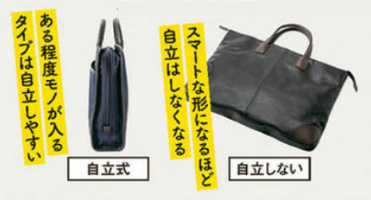 素材や色、大きさを重視して選べばいい手に持って使うフォーマルな形であれば、自立するかどうかを気にすることはありません。そもそもカバンを地面につけることは、ビジネスマナーではNGな行為。自立しなくても問題ないのです。