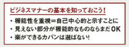 使いやすいカバンはいいのですが、そればかりを重視すると外見が二の次になり独善的に見えてしまいます。外見はオシャレで中は機能的だとスマートです。