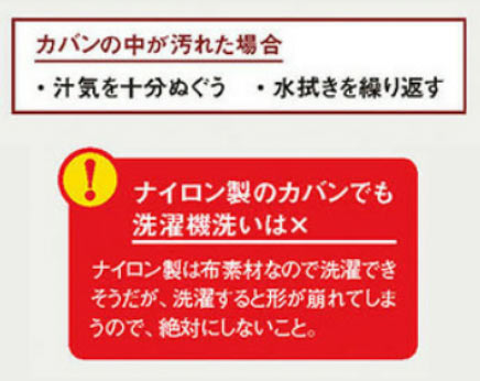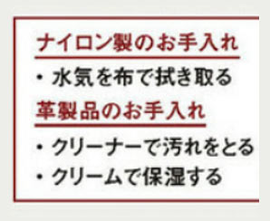 濡れたカバンは、まず水気を拭き取ります。ナイロンはそのまま乾かします。革の場合は水気を拭いたらついた汚れをクリーナーで落とし、靴用でないロウ分の少な乳化性のクリームを使って、保湿のケアをすることで長持ちします。