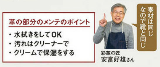 革のカバンも革靴と素材は同じなので、お手入れの基本は変わりません。水拭きして大丈夫ですし、汚れはクリーナーで落とせます。定期的にロウ分の少ない乳化性のクリームで潤いを与えましょう。
