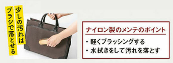 ナイロンは丈夫な素材で汚れにも強いので、普段は軽くブラッシングしてホコリを落とす程度で大丈夫です。汚れもシミになりにくいので水拭きでほとんどの場合落とすことができます。