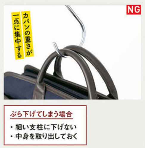 カバンを支柱に引っ掛ける際、細い支柱にかけるとカバンの重さが取っ手に集中し、傷む原因となります。太めの支柱にかけるか、2カ所にかけて重さを分散するようにします。また、かける時は中身を抜いてカバンを軽くしておきます。