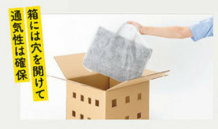 箱にしまう際は、ビニール袋など通気性の悪いものに入れるのはNGです。湿気がたまり、最悪カビが生えてしまいます。薄紙など余計な湿気を取るもので包んで入れましょう。