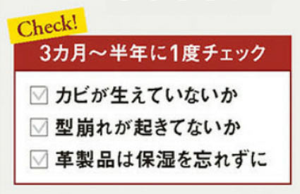 特に革製品の場合、蒸れだけでなく、乾燥によるひび割れなどのおそれがあるので、3カ月~半年に1回は、しまってある箱や袋から出して、保湿用にクリームを塗るなどのメンテを忘れないようにします。